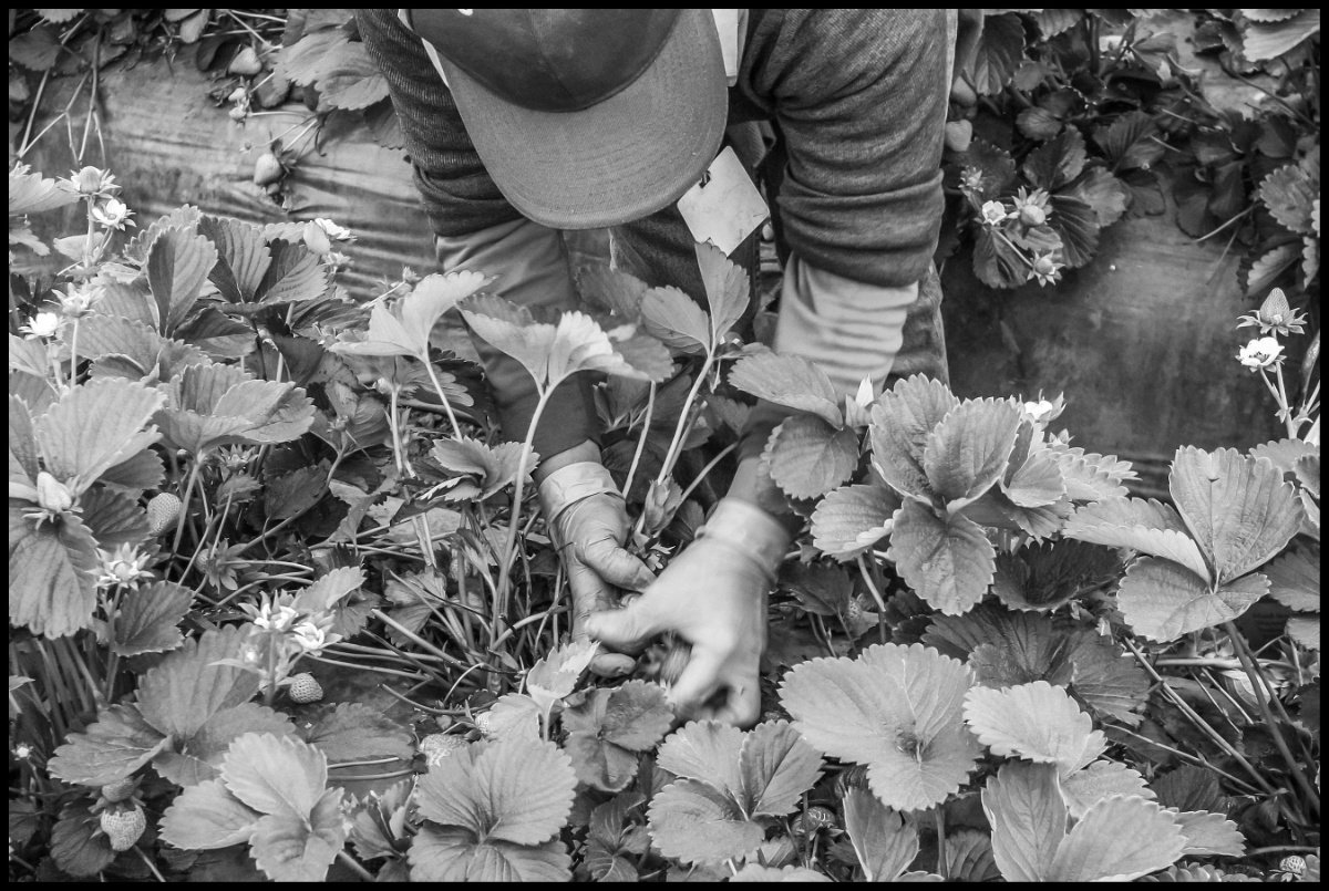 Picking strawberries is one of the most brutal jobs in agriculture. A worker picking wine grapes can labor standing up. But the men and women in the strawberry rows have to bend double to reach the berries, in raised beds about a foot high, covered in plastic. The pain of this labor is a constant, and it’s worse at the beginning of the season. Workers will say you just have to get through the first week, when your back hurts so much you can’t sleep, until your body adjusts and the pain somehow gets less. In March, rain fills the rows with water and the cart must be dragged through the mud. When summer comes, the field turns into an oven by midday.