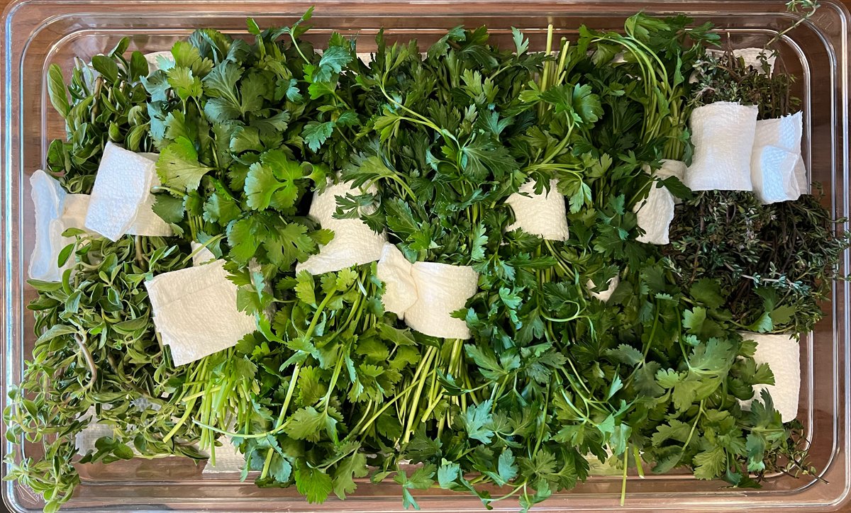 Herbs. Nurse advises against washing fresh herbs directly under hard running water, which can bruise the leaves. Instead, fill a large bowl or sink with cold water and float the herbs for a while. Lift them out and use a salad spinner to dry them as much as possible. For multiple kinds of herbs, nest a dry towel between the bunches in the salad spinner to keep from getting mixed up. Gather the stems in the same direction like a flower bouquet. Store the herbs upright in the refrigerator in a container with a little bit of water covering the stems. Or wrap the stems in a paper towel folded lengthwise, keeping the leaves loose, and store in an airtight container or Ziploc bag. “You throw a few bunches of herbs in there, squeeze out the air, zip it up, and it will last for at least two weeks,” Nurse says. This technique doesn’t work with basil, which should be washed right before using—and never refrigerated.
