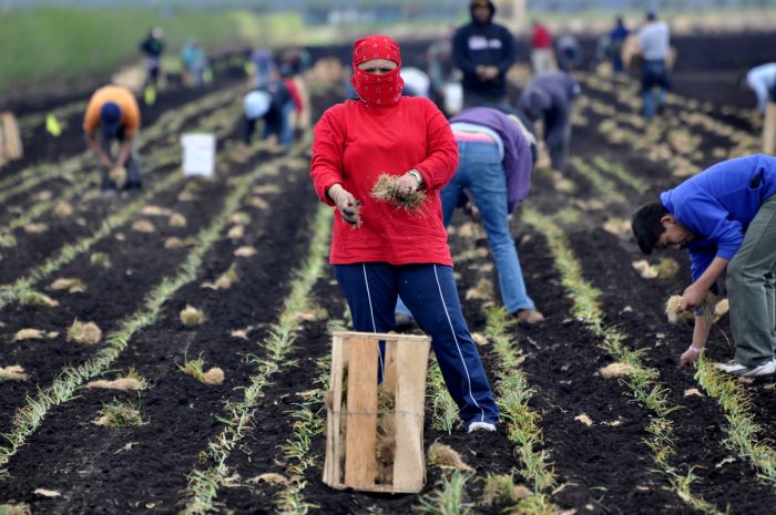 Mexican farmworkers plant onions by hand in the spring in Upstate New York.