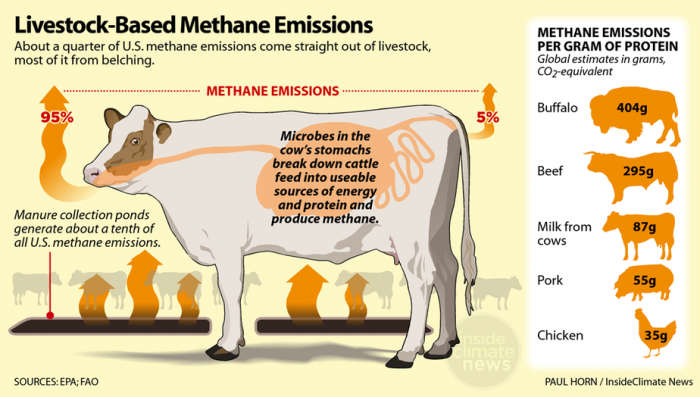 Emissions from livestock account for about 14.5 percent of total greenhouse gas emissions, globally, and roughly two thirds of those emissions come from cattle—mostly from methane burped by cows, growing feed and clearing land for grazing and feed crops.